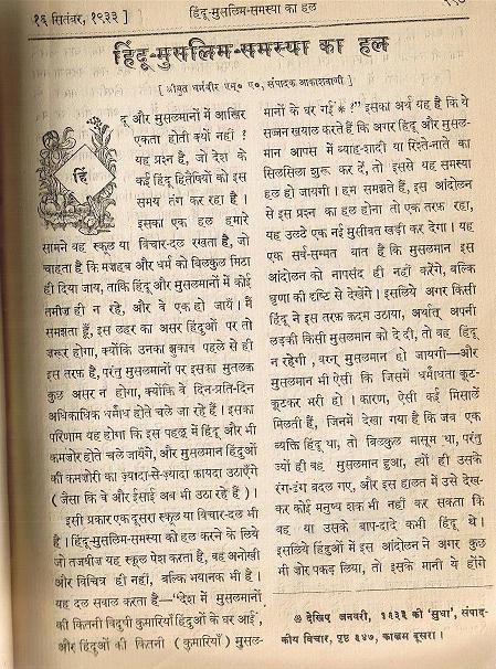 “हिन्दू मुस्लिम समस्या का हल” – धर्मवीर, सितम्बर 1933 सुधा