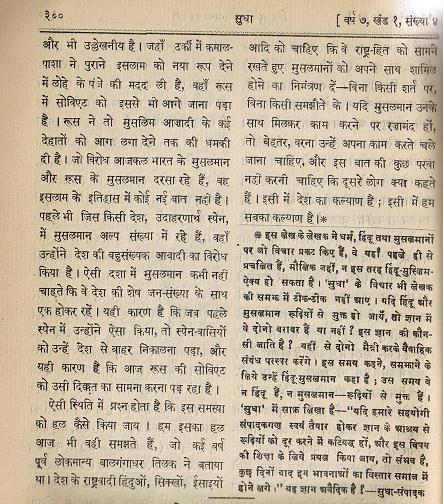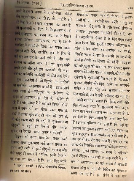 Attempting translation of concluding para: “In such a situation the question arises what after all is the solution to this crisis. We consider the solution to be the same today as the one given by Lokmanya Tilak many years back. The nation’s nationalist Hindus, Sikhs and Christians, keeping national interest foremost, should invite Muslims to join them without conditions or compromises of any sort. If Muslims agree to work with them then very well, and if not then these must continue to carry forward their work (for the nation) without caring for what any others have to say about it. In this alone lies the nation’s welfare and the welfare of each one of us.”