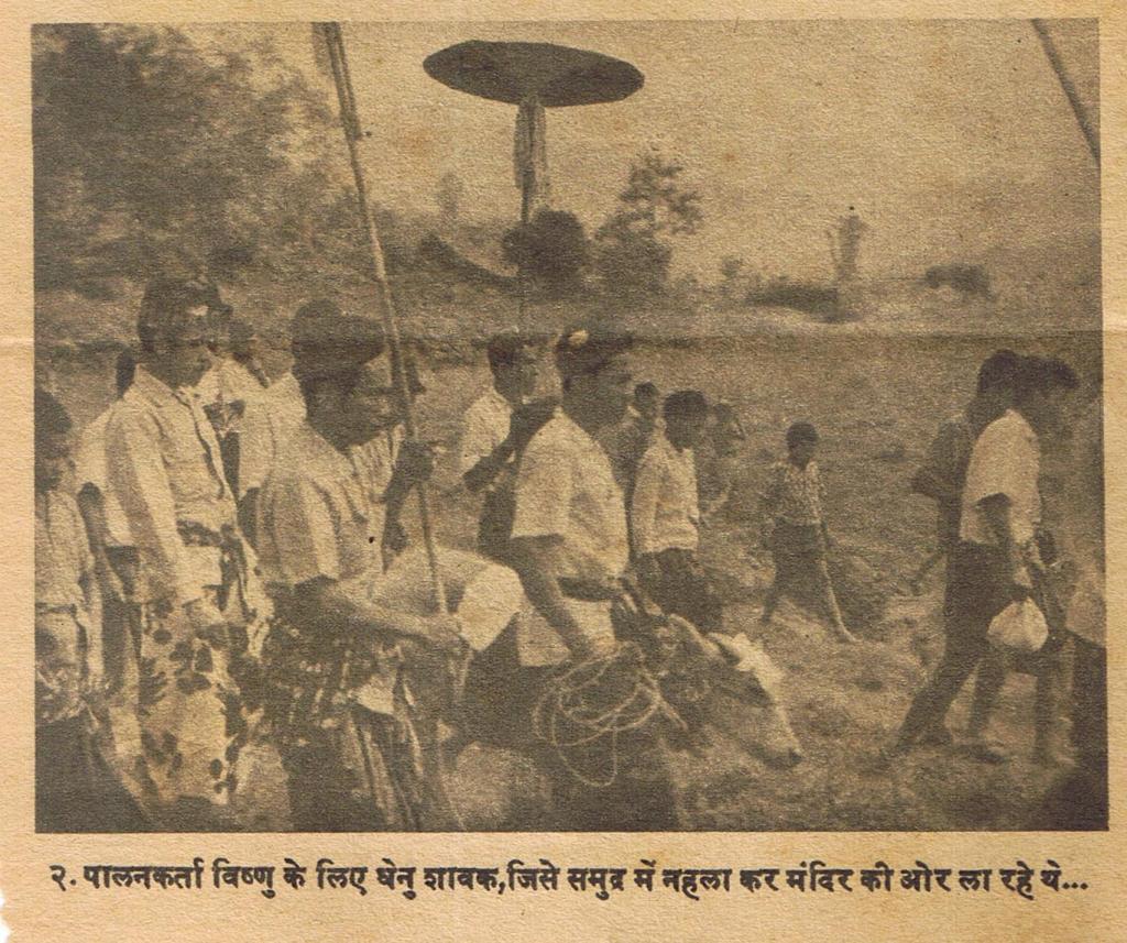 Devotees carrying a dhenu-shAvaka for viShNu after bathing in sea