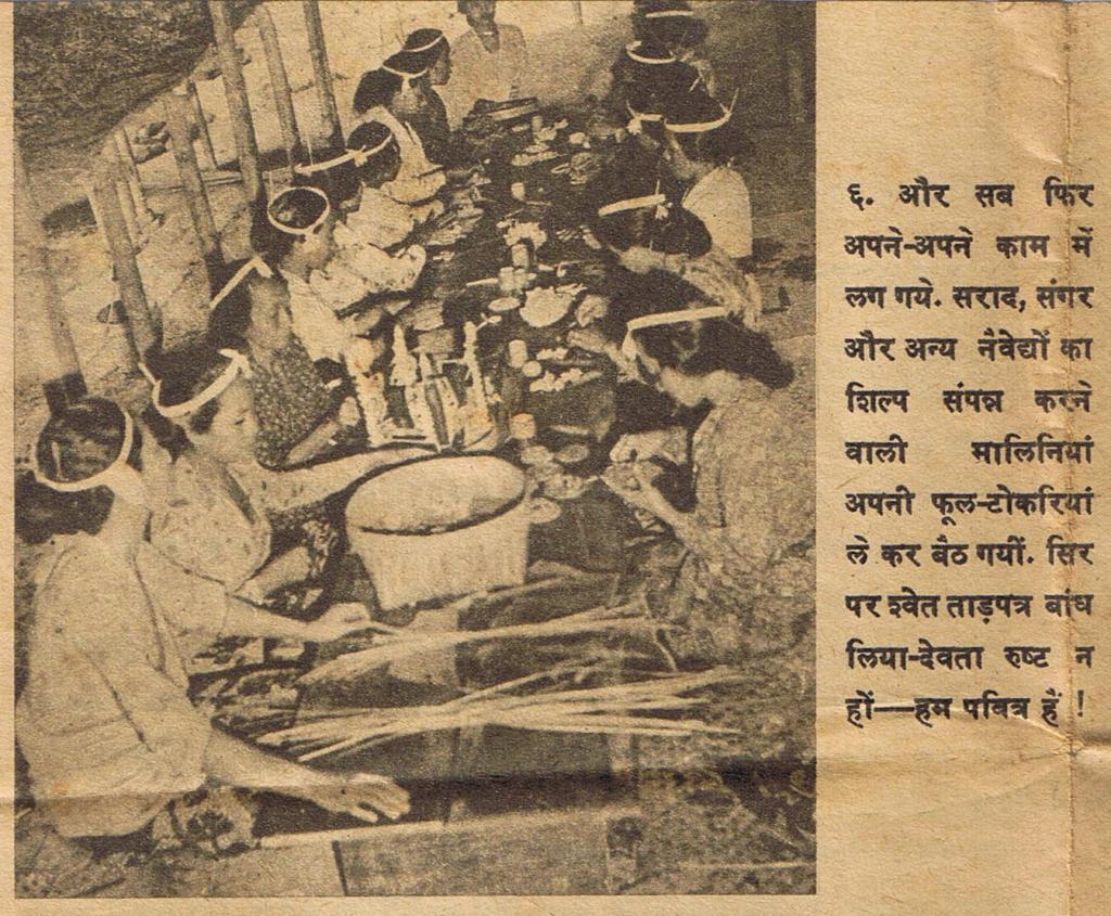 And then, disregarding the danger, all devotees went back to their duties. In above image, ladies prepare floral AbhUShaNa-s with which the devatA-s would be adorned. The bright tADapatra tied to their foreheads announces their cleanliness to perform such duty.