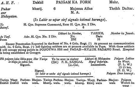 One document of Azad Hind Fauj, reproduced below, gives us glimpses of what that ‘National Lingua Franca’ of India looked like in Bose’s vision. This below is a template of form used for sending messages from army posts to the signals team. Do notice the pure unadulterated Urdu, only written in Roman alphabet: